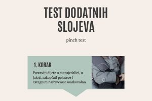 - Ukoliko između djeteta i pojaseva ima viška prostora (da možete provući ruku ili uraditi tzv. pinch test, odnosno da možete „uštinuti“ pojas palcem i kažiprstom) onda je jakna predebela za nošenje tokom vožnje.